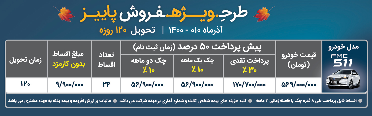 سدان FMC 511 نیز در این طرح با قیمت ۵۶۹ میلیون تومان و مبلغ اقساط ۹ میلیون و ۹۰۰ هزار تومانی به فروش میرسد. موعد تحویل سدان خودروسازی فردا در طرح مذکور ۱۲۰ روز کاری خواهد بود. لازم به ذکر است در این طرح، اقساط هر دو خودرو بدون کارمزد دریافت میشود.