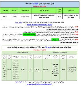 به اطلاع عموم متقاضیان محترم و نمایندگیهای مجاز میرساند، شرکت ایران خودرو در راستای ایجاد امکان ثبت نام و فرصت برابر برای همه متقاضیان خودرو و ایجاد ساز وکار شناسایی و عرضه خودرو به مصرف کنندگان واقعی طرح فروش نقدی و نقدی اعتباری خودروی هایما S5 بدون قرعه کشی با حذف محدویت پلاک فعال و کاهش فاصله زمان ثبت نام قبلی از ۴۸ ماه به ۱۸ ماه، با موعد تحویل ۳۰ روزه را با شرایط جدول زیر ارائه مینماید.