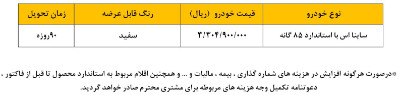 پیرو اعلام نتایج در دومین طرح سامانه یکپارچه عرضه خودروهای داخلی به‌اطلاع نمایندگی‌ها و متقاضیان حائز شرایطی که در طرح قانون حمایت از خانواده و جوانی‌جمعیت سامانه یکپارچه عرضه خودروهای داخلی در خردادماه سال‌ جاری نسبت‌به ثبت‌نام اولیه خودرو ساینا اقدام نموده و اولویت ایشان تابستان ۱۴۰۲ تعیین و در تاریخ ۱۴۰۲/۰۸/۲۳ پیامک به ایشان ارسال گردیده می‌رساند، امکان واریزوجه خودرو و ثبت‌نام مطابق شرایط ذیل اعلام میگردد.
