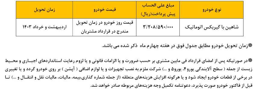 پیرو اعلام نتایج در دومین طرح سامانه یکپارچه عرضه خودروهای داخلی به اطلاع نمایندگیها و متقاضیان حائز شرایطی که در طرح حمایت از خانواده و جوانی جمعیت سامانه یکپارچه عرضه خودروهای داخلی در خردادماه سال جاری نسبت به ثبتنام اولیه خودرو شاهین با گیربکس اتوماتیک اقدام نموده و در تاریخ ۱۴۰۲/۱۰/۰۳ پیامک به ایشان ارسال گردیده میرساند، امکان واریزوجه خودرو و ثبتنام مطابق شرایط ذیل اعلام میگردد.