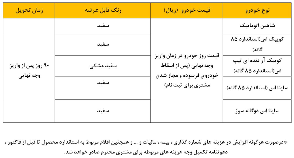 پیرو اجرای طرح جایگزینی خودروهای فرسوده غیرتاکسی در دومین طرح سامانه یکپارچه و مطابق آئیننامههای از رده خارج کردن خودروهای فرسوده و آئیننامه موضوع ماده ۸ قانون هوای پاک و اصلاحات آن به اطلاع نمایندگیها و متقاضیان حائزشرایط طرح مذکور که نسبت به انتخاب خودروهای شاهین اتوماتیک که اولویت ایشان تابستان و پاییز ۱۴۰۲، کوییک اس (استاندارد ۸۵ گانه)، کوییک R دندهای تیپ اس (استاندارد ۸۵ گانه)، ساینا S (استاندارد ۸۵ گانه)، ساینا S دوگانهسوز که اولویت ایشان تابستان ۱۴۰۲ تعیین و در تاریخ ۱۴۰۲/۰۸/۲۰ پیامک برای ایشان ارسال گردیده میرساند، امکان واریز وجه مطابق شرایط ذیل پس از احراز شرایط و اسقاط خودرو فراهم میگردد.