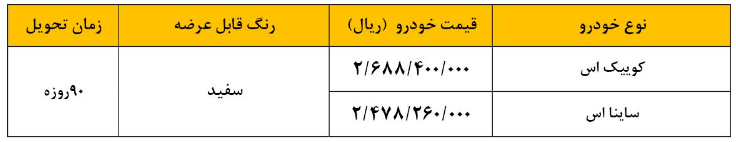 پیرو اعلام نتایج در دومین طرح سامانه یکپارچه تخصیص خودرو به اطلاع نمایندگیها و متقاضیان حائز شرایطی که در طرح عادی سامانه یکپارچه عرضه خودرو در خردادماه سال جاری نسبت به انتخاب خودروی کوییک اس اقدام نموده و اولویت زمان تحویل ایشان تابستان ۱۴۰۲ و جهت آندسته از متقاضیانی که خودرو ساینا اس انتخاب نموده و اولویت زمان تحویل ایشان پاییز ۱۴۰۲ تعیین و در تاریخ ۱۴۰۲/۰۴/۲۰ پیامک به ایشان ارسال گردیده میرساند، امکان واریز وجه خودرو و ثبتنام مطابق شرایط ذیل اعلام میگردد.