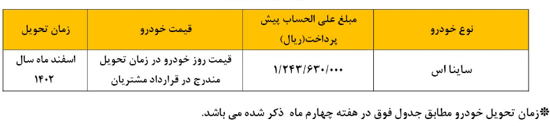 پیرو اعلام نتایج در دومین طرح سامانه یکپارچه عرضه خودروهای داخلی به اطلاع نمایندگیها و متقاضیان حائز شرایط طرح قانون حمایت از خانواده و جوانی جمعیت که در سامانه یکپارچه عرضه خودروهای داخلی در خردادماه سال جاری نسبت به انتخاب خودرو ساینا اس اقدام نموده و اولویت زمان تحویل ایشان زمستان ۱۴۰۲ تعیین و در تاریخ ۱۴۰۲/۰۵/۰۲ پیامک به ایشان ارسال گردیده میرساند، امکان واریز وجه خودرو و ثبتنام مطابق شرایط ذیل اعلام میگردد.