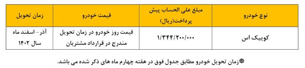 پیرو اعلام نتایج در دومین طرح سامانه یکپارچه عرضه خودروهای داخلی به اطلاع نمایندگیها و متقاضیان حائز شرایط طرح عادی که در سامانه یکپارچه عرضه خودروهای داخلی در خردادماه سال جاری نسبت به انتخاب خودرو کوییک اس اقدام نموده و اولویت زمان تحویل ایشان پاییز و زمستان ۱۴۰۲ تعیین و در تاریخ ۱۴۰۲/۰۴/۲۹ پیامک به ایشان ارسال گردیده میرساند، امکان واریز وجه خودرو و ثبتنام مطابق شرایط ذیل اعلام میگردد.