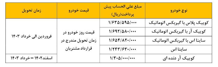 پیرو اعلام نتایج در دومین طرح سامانه یکپارچه عرضه خودروهای داخلی به اطلاع نمایندگیها و متقاضیان حائز شرایط طرح عادی که در سامانه یکپارچه عرضه خودروهای داخلی در خردادماه سال جاری نسبت به انتخاب خودرو کوییک پلاس با گیربکس اتوماتیک، کوییک آر با گیربکس اتوماتیک، ساینا اس با گیربکس اتوماتیک و ساینا اس اقدام نموده و اولویت زمان تحویل ایشان بهار ۱۴۰۳ و جهت آن دسته از متقاضیان خرید خودرو کوییک آر دندهای که تحویل ایشان زمستان ۱۴۰۲ تعیین و در تاریخ ۱۴۰۲/۰۵/۱۷ پیامک به ایشان ارسال گردیده میرساند، امکان واریز وجه خودرو و ثبتنام مطابق شرایط ذیل اعلام میگردد.
