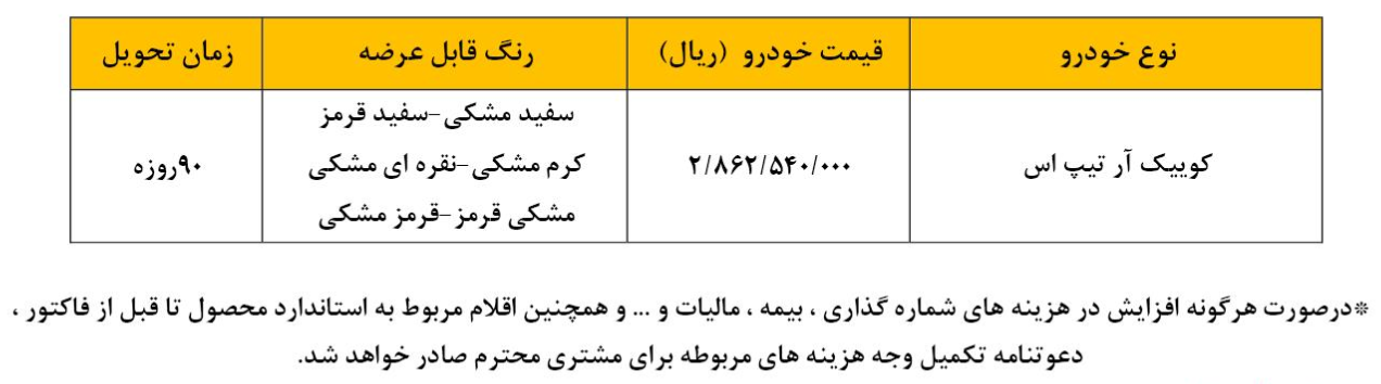 پیرو اعلام نتایج در دومین طرح سامانه یکپارچه تخصیص خودرو به اطلاع نمایندگیها و متقاضیان حائز شرایطی که در طرح عادی سامانه یکپارچه عرضه خودرو در خرداد ماه سال جاری نسبت به ثبتنام اولیه خودرو کوییک R اقدام نموده و اولویت ایشان پاییز و زمستان ۱۴۰۲ تعیین و در تاریخ ۱۴۰۲/۰۸/۰۳ پیامک به ایشان ارسال گردیده میرساند، امکان واریز وجه خودرو و ثبتنام مطابق شرایط ذیل اعلام میگردد.