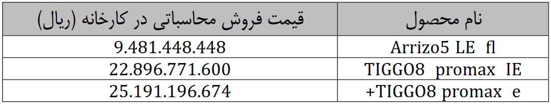 براساس مصوبه شورای رقابت قیمت Arrizo5 IE fl برابر ۹۴۸ میلیون و ۱۴۴ هزار تومان، قیمت(TIGGO8 promax IE ) 2 میلیارد و ۲۸۹ میلیون تومان وTIGGO8 promax e+ هم ۲ میلیارد و ۵۱۹ میلیون تومان تعیین شده‌است.