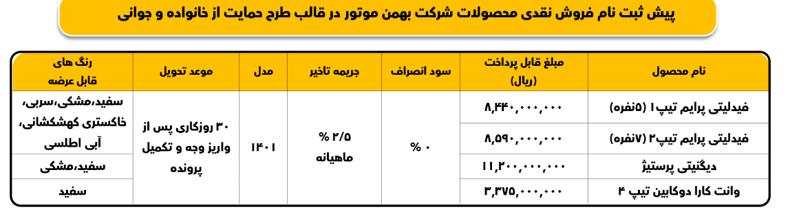 این طرح ویژه‌ی مادران است. برای جزئیات بیشتر در مورد ثبت نام محصولات گروه بهمن موتور با شماره ۴۸۰۲۷-۰۲۱ پیگیری بفرمایید.