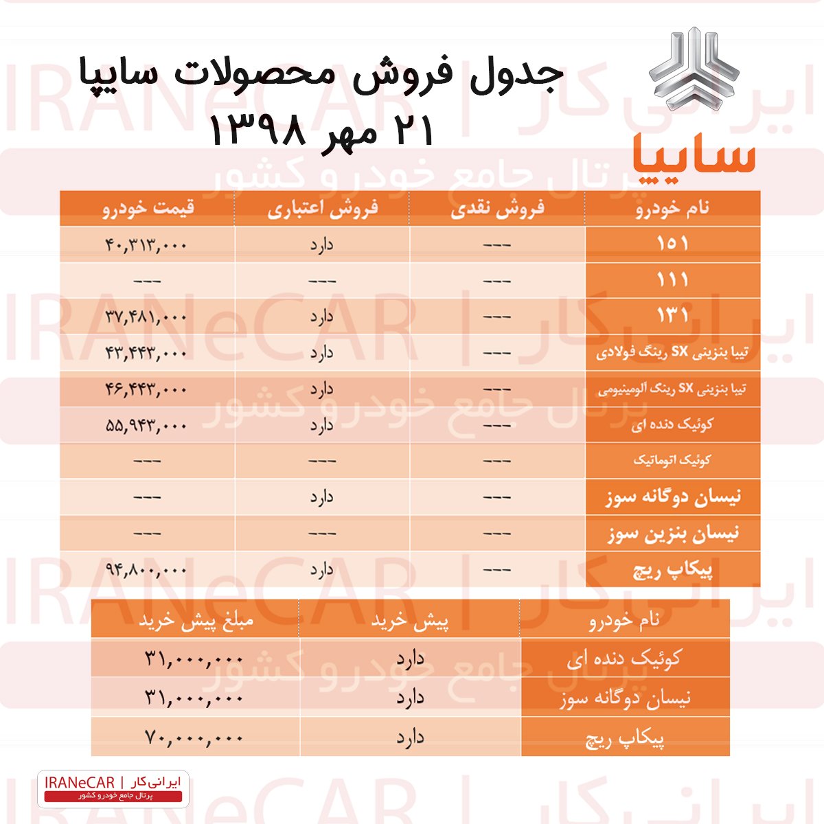 برنامه فروش خودروهای سایپا (۲۱ مهر)