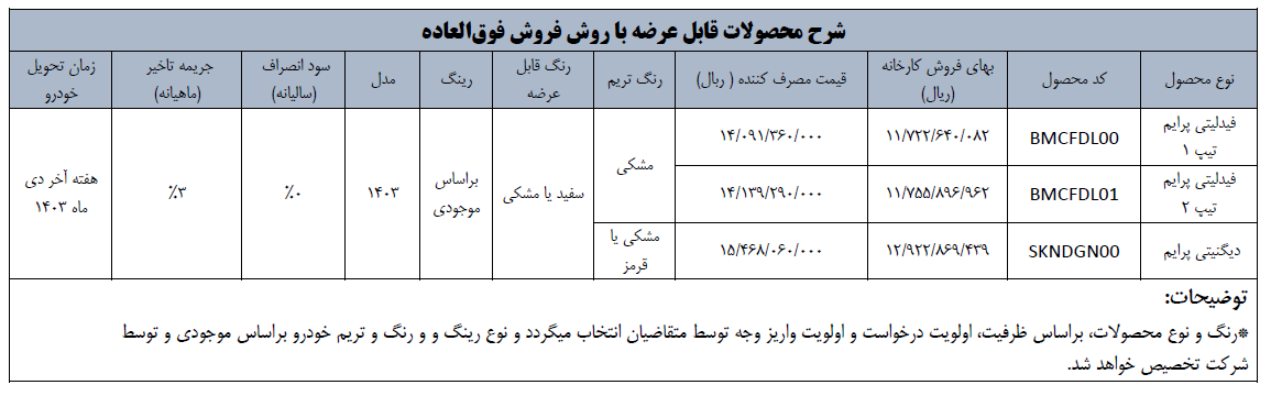 احتراماً، پیرو بخشنامه شماره ۱۴۰۲/۱۱۲۲ مورخ ۱۴۰۲/۰۲/۰۴ به اطلاع متقاضیان محترم و عاملیتهای مجاز میرساند،امکان تکمیل فرآیند ثبتنام و واریز وجه، جهت بخشی از متقاضیان سامانه یکپارچه عرضه خودروهای داخلی در قالب طرح ” عادی” و با توجه به اولویتبندی اعلام شده از سوی وزارت صمت با نوبت زمستان ۱۴۰۲، برای فیدلیتی و دیگنیتی و به صورت روش فروش فوقالعاده و به صورت آنلاین فراهم گردیده است. لذا متقاضیان میتوانند نسبت به واریز وجه خودرو به صورت آنلاین از ساعت ۱۰:۰۰ صبح روز شنبه مورخ ۱۴۰۳/۰۶/۱۷ لغایت ۲۴:۰۰ روز دوشنبه مورخ ۱۴۰۳/۰۶/۲۶ اقدام فرمایند.