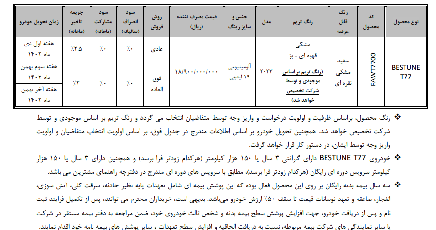 تکمیل وجه متقاضیان طرح یکپارچه عرضه خودروهای وارداتی (خوودروی 77T BESTUNE) در قالب طرح عادی و فروش فوق العاده