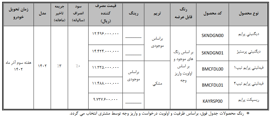 پیرو بخشنامه شماره ۱۴۰۲/۱۱۲۲ مورخ ۱۴۰۲/۰۲/۰۴ به اطلاع عموم متقاضیان محترم و عاملیتهای مجاز میرساند، نحوه تکمیل فرآیند ثبتنام متقاضیان طرح سامانه یکپارچه عرضه خودروهای داخلی (طرح عادی)، با توجه به اولویتبندی اعلام شده از سوی وزارتصمت با نوبت مهرماه ۱۴۰۲، بهصورت فروش فوقالعاده خودروی دیگنیتی پرایم فراهم گردیده است.همچنین در این مرحله از ثبتنام انتخاب محصولات دیگر نیز در صورت تمایل مشتریان به شرح جدول ذیل مهیا میباشد، لذا متقاضیان میتوانند نسبتبه واریزوجه خودرو بهصورت آنلاین از ساعت ۱۰:۰۰ روز شنبه مورخ ۱۴۰۲/۰۷/۰۱ لغایت ساعت ۲۴:۰۰ روز یکشنبه مورخ ۱۴۰۲/۰۷/۰۹ با شرایط ذیل اعلام میگردد و بازه زمانی مذکور قابل تمدید نمیباشد.