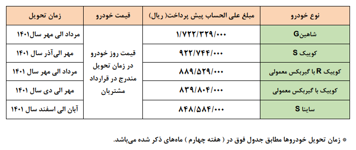 مطابق بخشنامه اعلامی گروه خودروسازی سایپا، شرایط پیش فروش یکساله محصولات گروه خودروسازی سایپا به شرح جدول ذیل اعلام می گردد:
