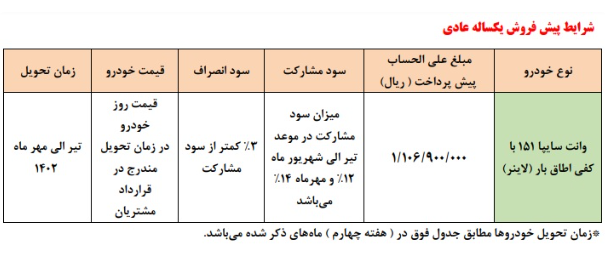 به اطلاع متقاضیان محترم و نمایندگی های مجاز گروه خودروسازی سایپا میرساند، شرایط پیش فروش خودروی وانت سایپا ۱۵۱ با کفی اطاق بار (لاینر) به شرح جدول ذیل اعلام میگردد.