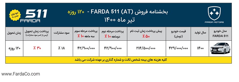 شرکت خودروسازی فردا، شرایط فروش ویژه تیر ماه ۱۴۰۰ را برای سدان جدید FMC ۵۱۱ اعلام کرد.