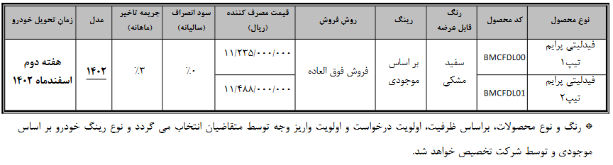 پیرو بخشنامه شماره ۱۴۰۲/۱۱۲۳ مورخ ۱۴۰۲/۰۲/۰۴ به اطلاع عموم متقاضیان محترم و عاملیتهای مجاز میرساند، امکان تکمیل فرآیند ثبتنام خودروی فیدلیتی پرایم برای متقاضیان سامانه یکپارچه عرضه خودروهای داخلی (طرح حمایت از خانواده و جوانی جمعیت)، باتوجه به اولویتبندی اعلام شده از سوی وزارت صمت با نوبت آذرماه ۱۴۰۲، بهصورت فروش فوقالعاده و آنلاین فراهم گردیده است. لذا متقاضیان میتوانند نسبتبه واریزوجه خودرو بهصورت آنلاین از ساعت ۱۰:۰۰ صبح روز پنجشنبه مورخ ۱۴۰۲/۰۹/۳۰ لغایت ساعت ۲۴:۰۰ روز سهشنبه مورخ ۱۴۰۲/۱۰/۰۵ اقدام فرمایند. شایان ذکر است بازهی زمانی مذکور بههیچ عنوان قابل تمدید نمیباشد.