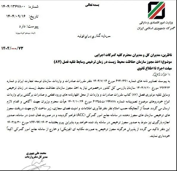 بر اساس این ابلاغیه که از سوی محمدعلی بهپوری، مدیرکل دفتر واردات گمرک ایران، صادر شده، تمامی خودروهای مشمول فصل ۸۷ تعرفه گمرکی برای ورود به کشور، چه در قالب واردات قطعی و چه صادرات برگشتی، باید مجوز محیطزیست دریافت کنند.