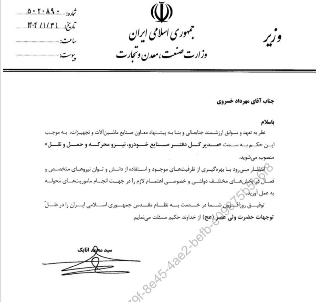 با حکم سید محمد اتابک، وزیر صنعت، معدن و تجارت، مهرداد خسروی به عنوان مدیرکل دفتر صنایع خودرو، نیرومحرکه و حملونقل این وزارتخانه منصوب شد.