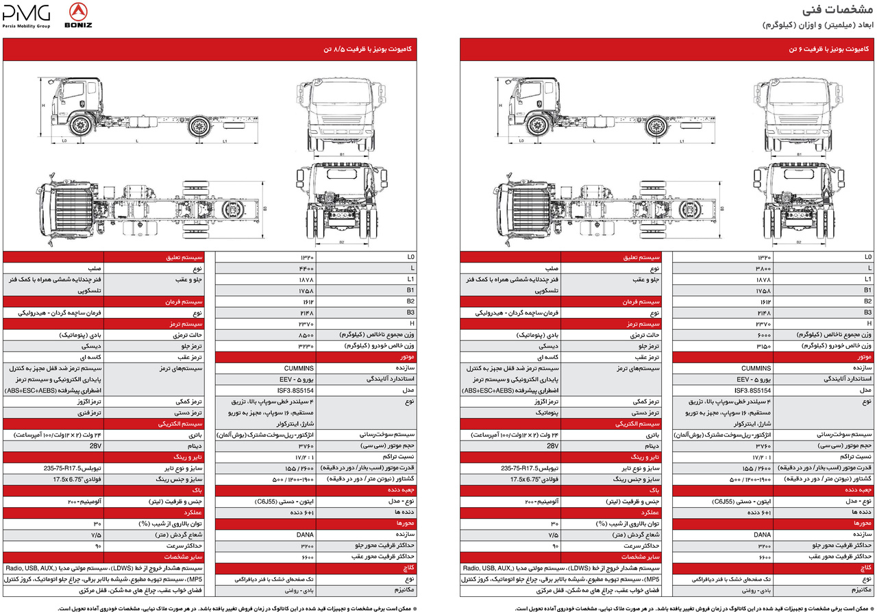 کامیونتهای بونیز ۶ تن و ۸.۵ تن با مشخصات فنی بسیار متمایز و بهرهمندی از موتور پرقدرت کامینز ۱۶ سوپاپ و مجهز به توربوشارژ، استاندارد آلایندگی یورو ۵ و با ۱۵۵ اسب بخار، با گیربکس دستی ۶ دنده و با آپشنهای متنوع از جمله مولتی مدیا، سیستم هشدار خروج از خطوط، سیستم تهویه مطبوع، شیشه بالابر برقی، کروز کنترل، سیستم چراغ جلو اتوماتیک، فضای خواب، چراغ مهشکن، قفل مرکزی، کمک فنر تلسکوپی و … عرضه میشود.