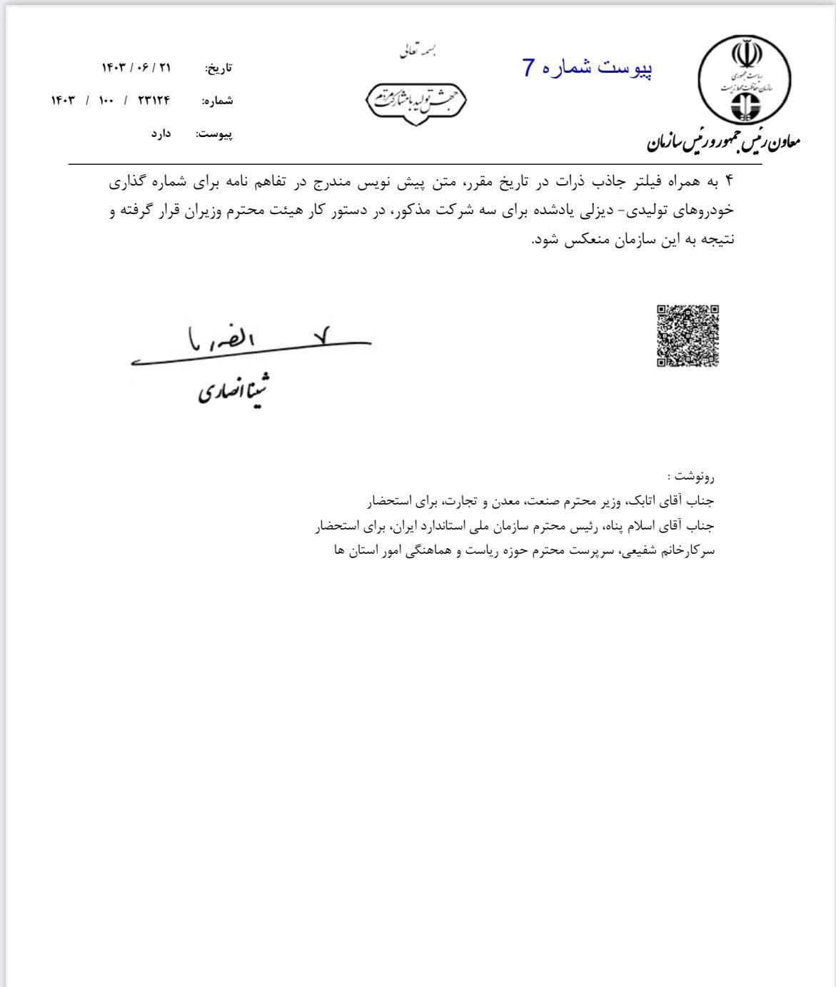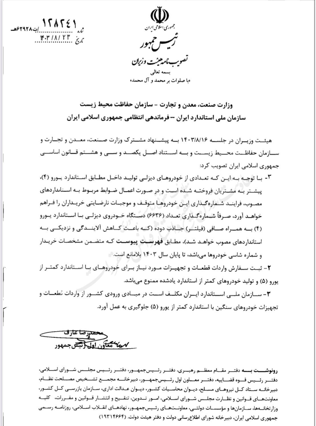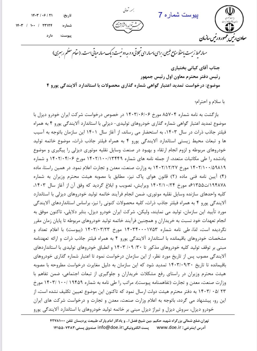 “با توجه به این که تعدادی از خودروهای دیزلی تولید داخل مطابق استاندارد یورو (۴)، پیشتر به مشتریان فروخته شده است و درصورت اعمال ضوابط مربوط به استانداردهای مصوب فرایند شمارهگذاری این خودروها متوقف و موجبات نارضایتی خریداران را فراهم خواهد آورد، صرفاً شمارهگذاری تعداد (۶۶۳۶) دستگاه خودروی دیزلی با استاندارد یورو (۴) به همراه صافی (فیلتر) جاذب دوده که باعث کاهش آلایندگی و نزدیکی به استانداردهای مصوب خواهد شد مطابق فهرست پیوست که متضمن مشخصات خریدار و شماره شاسی خودروها میباشد تا پایان سال ۱۴۰۳ بلامانع است.”