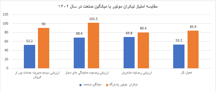 در واقع در شاخص ارزیابی سیستم خدمات پس از فروش میانگین صنعت در سال گذشته ۵۲.۲ ، در شاخص ارزیابی تعمیرگاه‌های مجاز ۶۸.۶ و در شاخص رضایت مشتریان ۶۹.۸ است. این در حالی است که به ترتیب شاخص‌ها، شرکت نیکران موتور پاسارگاد موفق به اخذ میانگین امتیاز ۹۰ در شاخص ازریابی سیستم مدیریت خدمات پس از فروش، امتیاز ۸۰.۴ در رضایت مندی مشتری و امتیاز ۱۰۱.۵ در وضعیت نمایندگی مجاز خود شده است که گواه اختلاف کیفی محسوس این شرکت در تمامی شاخص‌های خدمات پس از فروش و رضایت مشتری  با میانگین صنعت است.