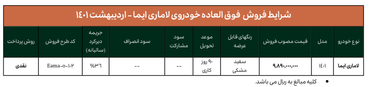 فروش فوق العاده خودرو لاماری ایما به قیمت قطعی و با موعد تحویل ۹۰ روز کاری به صورت قرعه کشی از طریق سامانه یکپارچه تخصیص خودرو (زیر نظر دستگاه های نظارتی) با شرایط زیر اقدام نماید. متقاضیان می توانند از ساعت ۹ صبح روز سه شنبه مورخ ۱۴۰۱/۰۲/۲۷ تا  ساعت ۹ روز سه شنبه مورخ ۱۴۰۱/۰۳/۰۳ به صورت اینترنتی و از طریق سایت https://sale.iranecar.com ثبت نام نمایند.